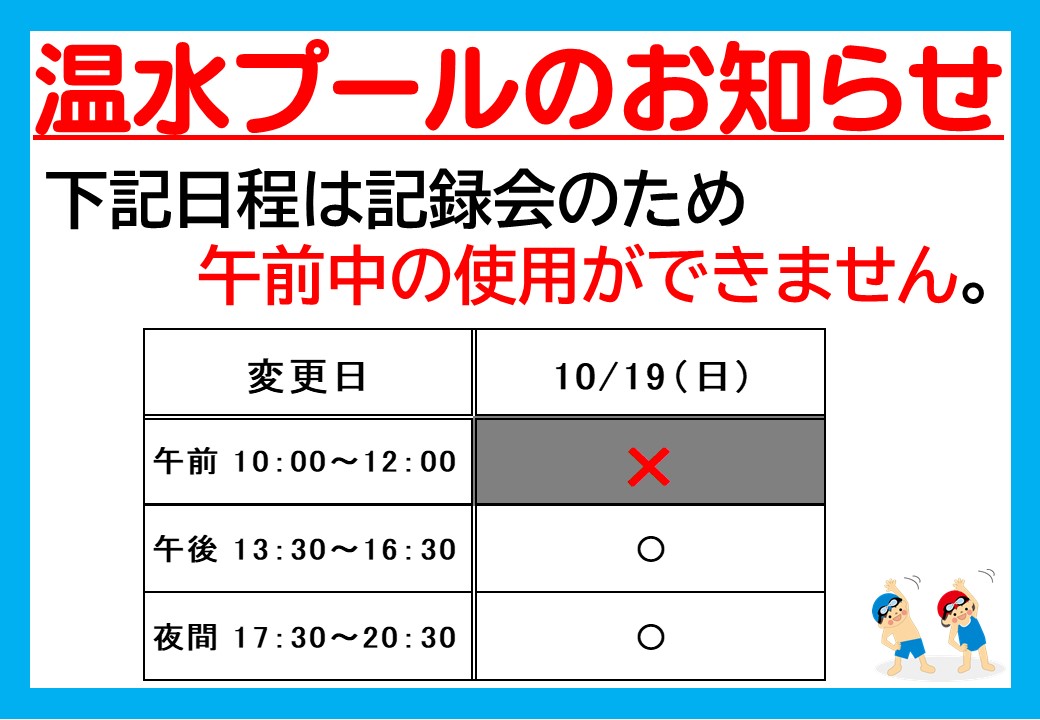 令和7年10月温水プールのお知らせ 2025.09.27令和7年10月の温水プールのお知らせです。この他にも緊急でメンテナンス等が入る場合がございます。※詳しくは三原リージョンプラザまで、お問い合わせください。令和7年11月~令和8年1月まで、長寿命化改修工事のため休館となります。温水プール利用再開は令和8年2月からの予定です。ご迷惑をおかけいたしますが、ご理解のほど、よろしくお願いいたします。