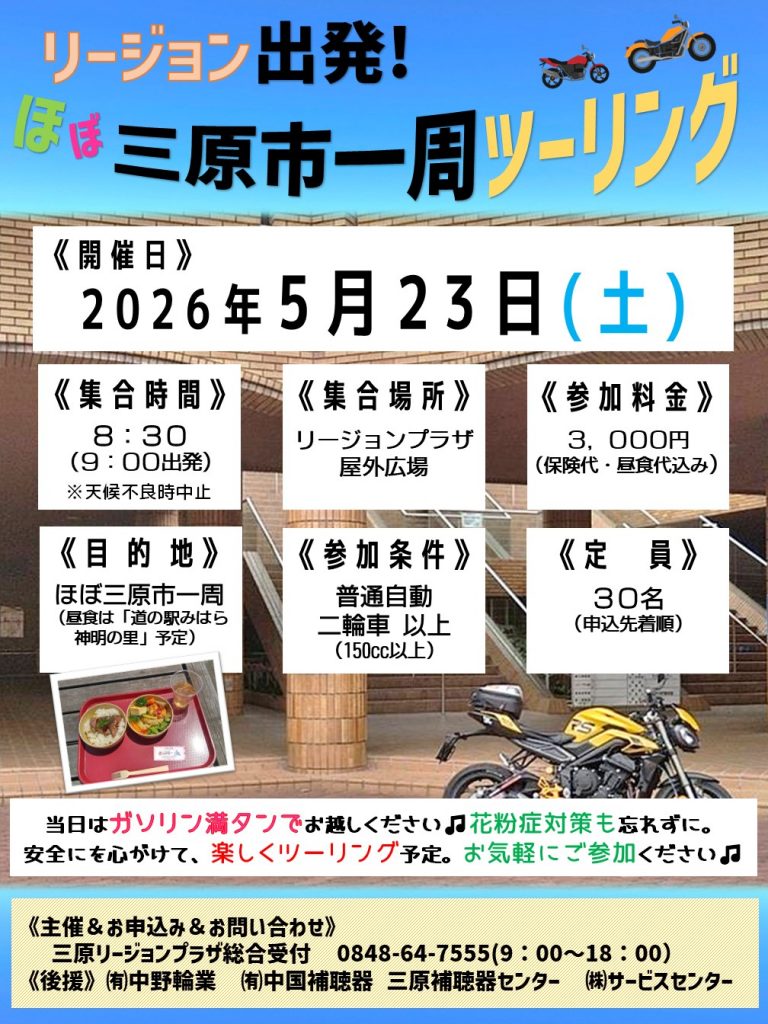 リージョン出発!ほぼ三原市一周ツーリング 2026.03.25リージョンに集合して、みんなでツーリングに行こう!普通自動二輪車(150cc以上)で参加OK。三原をほぼ一周する予定です。ぜひご参加ください。申し込みは三原リージョンプラザ総合受付まで。